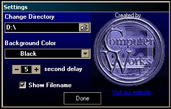 A program that displays all JPGs, GIFs, and BMPs within a directory, as a slideshow. Right-click to pop-up a menu and choose Settings (shown on the left) to change directories, background color, time of delay, and the showing of the filename. From the pop-up menu, you can also choose to copy, move, and delete the image you're viewing. Use it as a screen saver. Show off your pictures. |